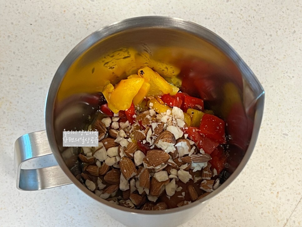 [로메스코소스] 파프리카 1개, 토마토 1개, 견과류 60g한줌, 파마산치즈가루 60g, 올리브유 60g, 마늘 3~5알, 소금 1t, 후추 약간, 핸드그라인더 필수
